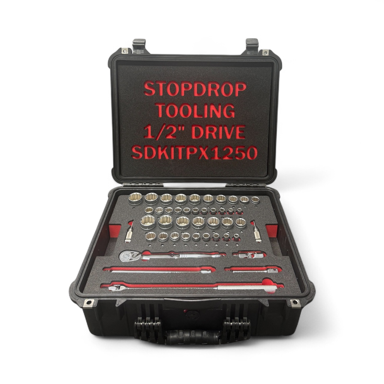 Stopdrop Tooling 1/2” Drive Mobile Tool Kits for ‘Working at Height’ have been designed for jobs that require a full range of 1/2” drive sockets. It comes in a waterproof, crush proof and dust proof 1650 Pelican Case featuring an ergonomic handle, stainless steel hardware and padlock protectors, automatic pressure equalization valve and tool control foam.